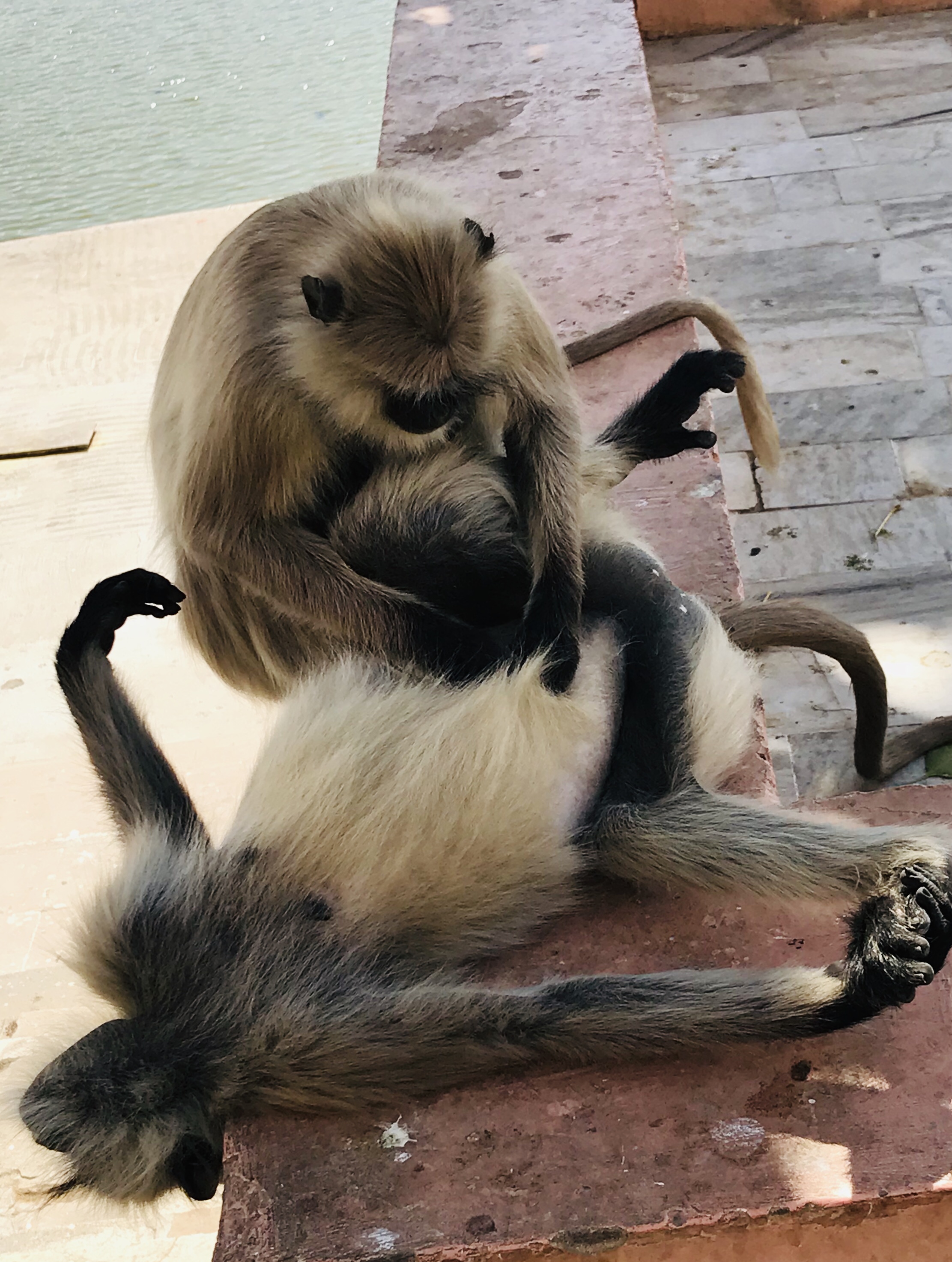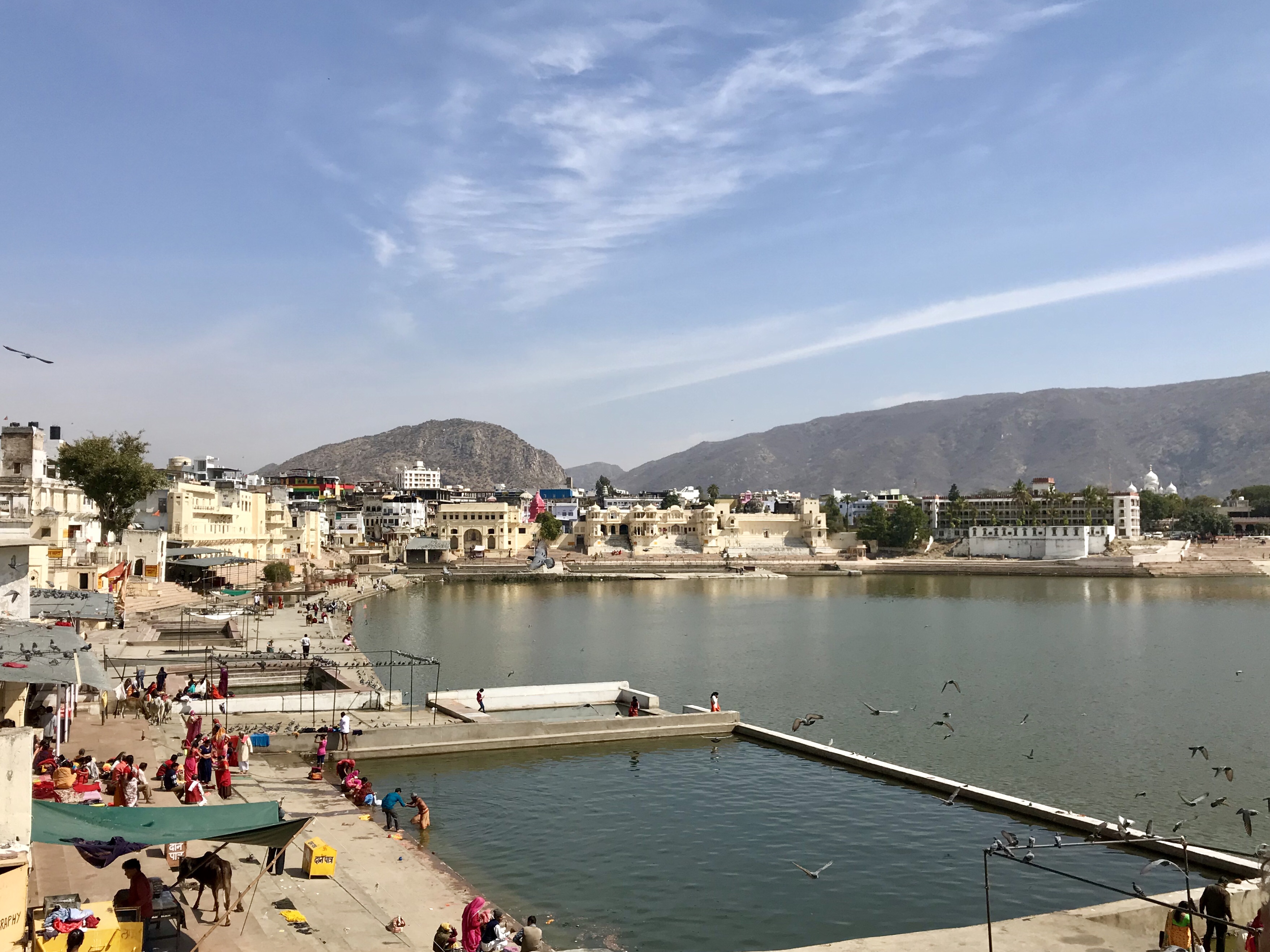 Pushkar est une petite ville enroulée autour d'un lac rempli de pélicans et qui est en fait un grand bassin où se versent d'innombrables escaliers descendant de "temples" délabrés où s'épouillent des singes.