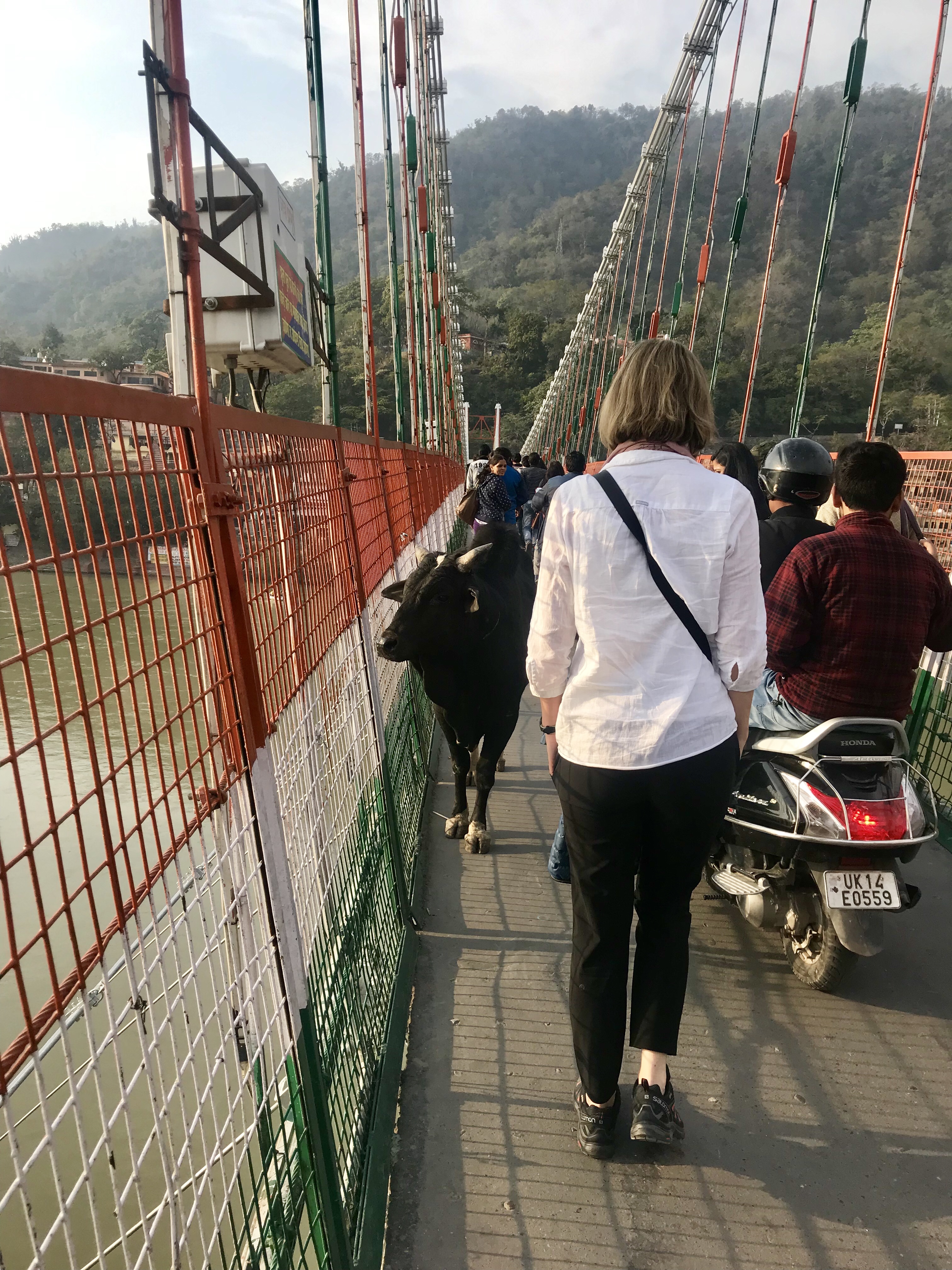 La circulation sur les ponts suspendus est dense et les piétons doivent s'y frayer un chemin entre les vaches et les motos, le tout pendant que la structure ondule sensiblement sous le poids de cette circulation.