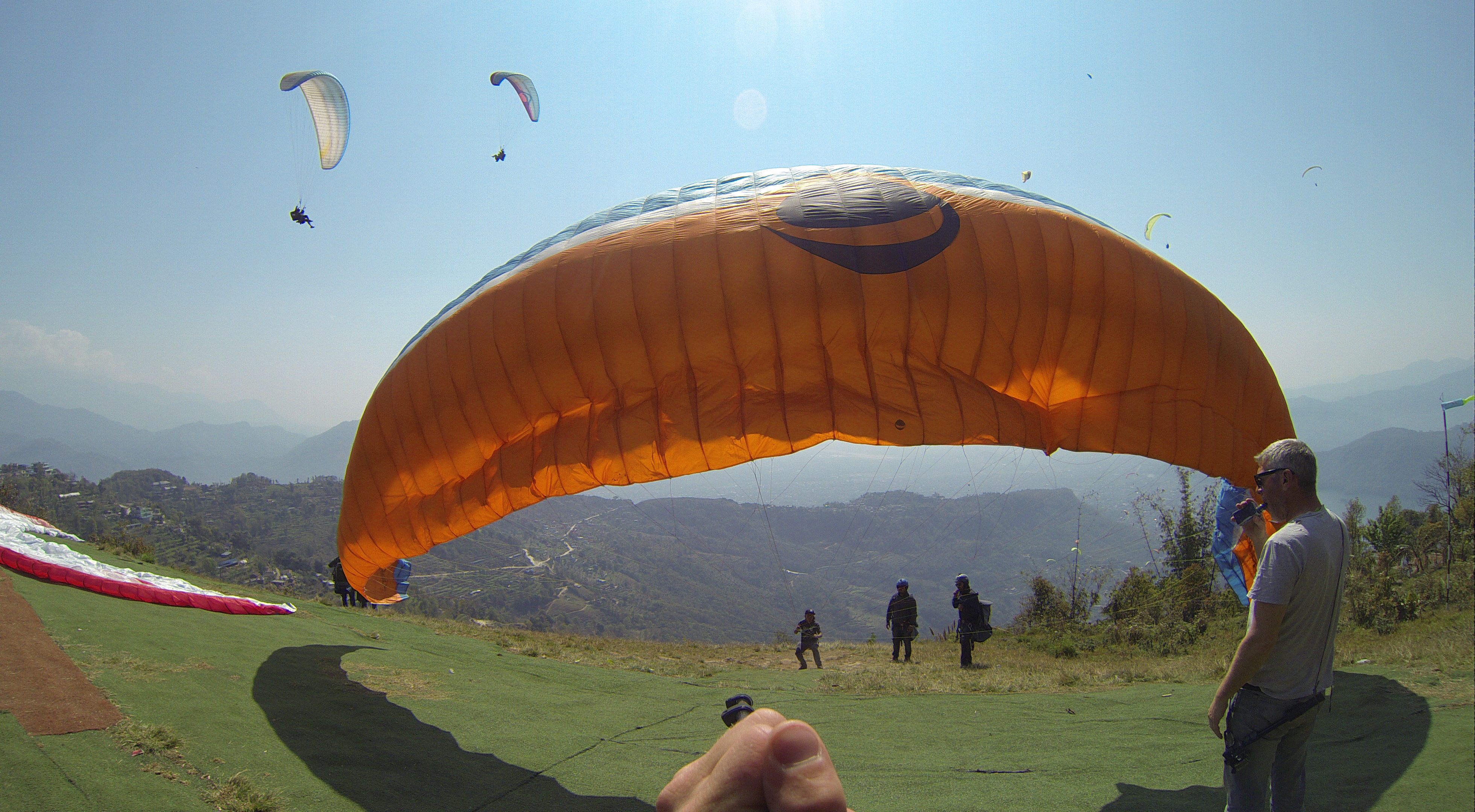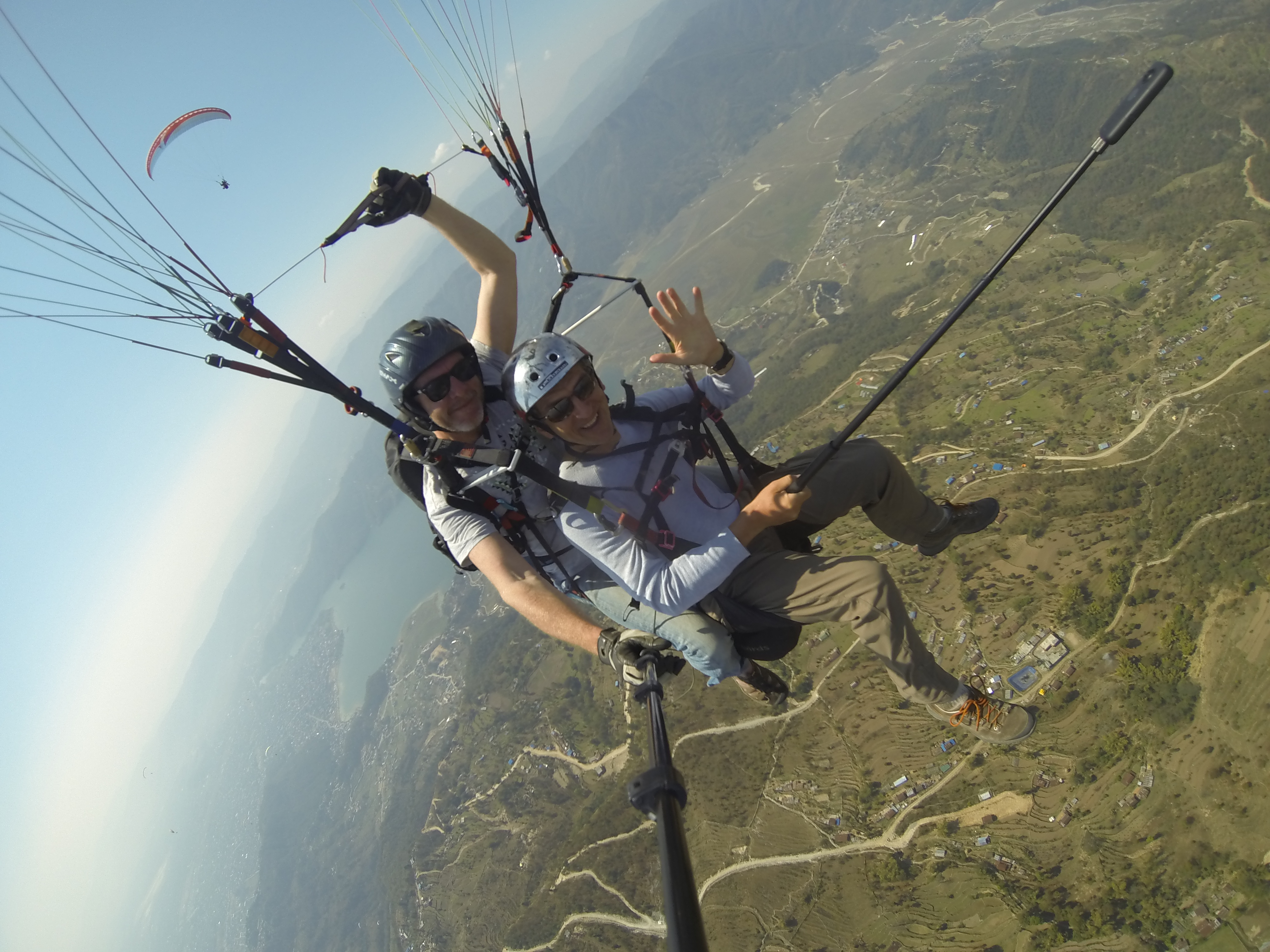 Nos deux décollages se font sans histoire et nous nous retrouvons, flottant légèrement dans le ciel de Pokhara, sans bruit, et entreprenons de grands virages pour profiter des colonnes d'air ascendant afin de prendre de l'altitude.