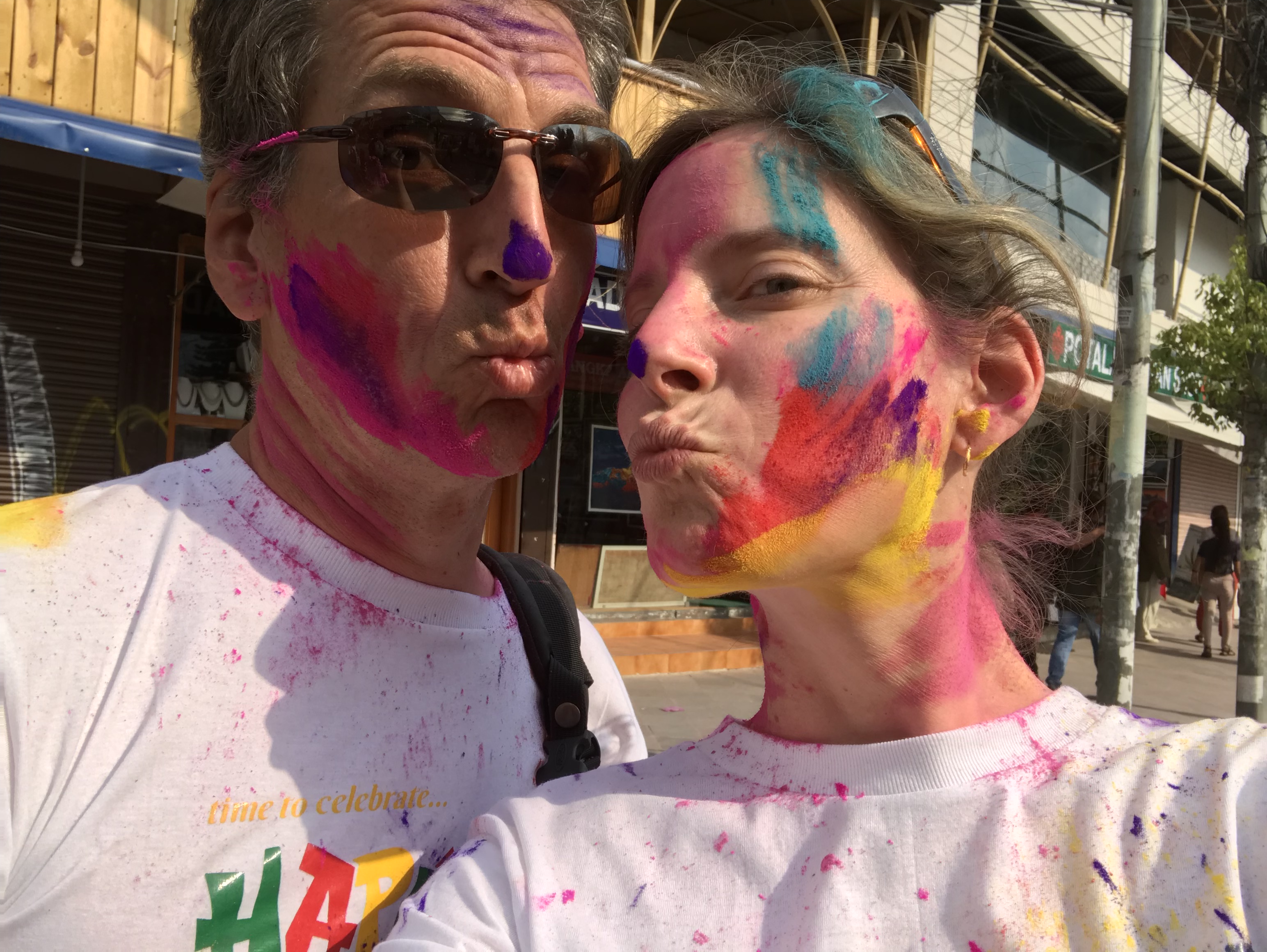 Au début, notre apparence immaculée retient sans doute les passants mais un premier groupe nous baptise et rapidement nous nous retrouvons bariolés et nous nous procurons aussi notre stock de poudre colorée pour passer en mode actif. Quelques jeunes appliquent parfois la poudre de façon un peu brusque mais globalement, le tout est plutôt respectueux et bon enfant, et l'ambiance est vraiment festive. Nous terminerons la fête sérieusement colorés!!! NOTE: Même Mauricio n'a pas été épargné à Katmandou...