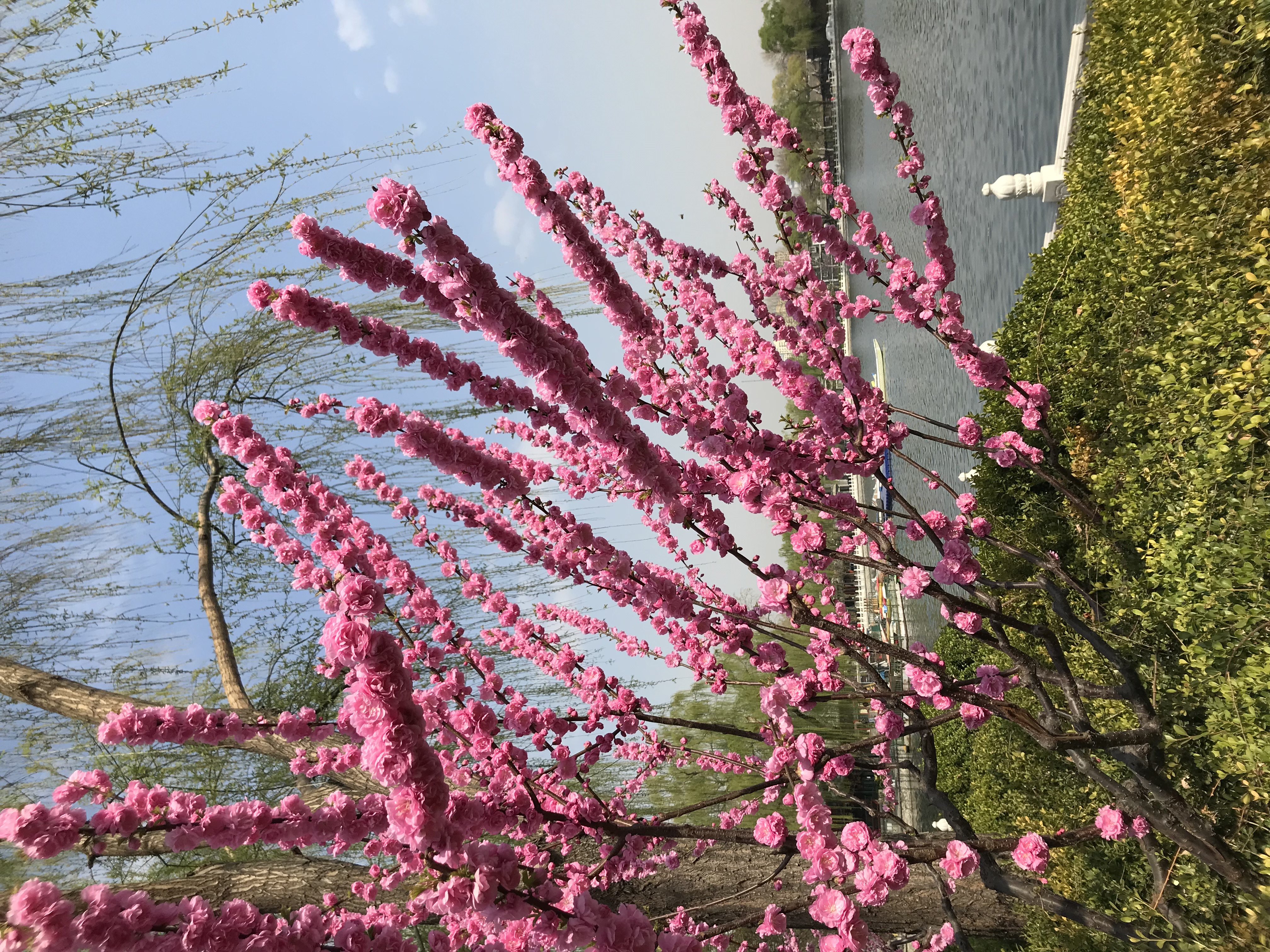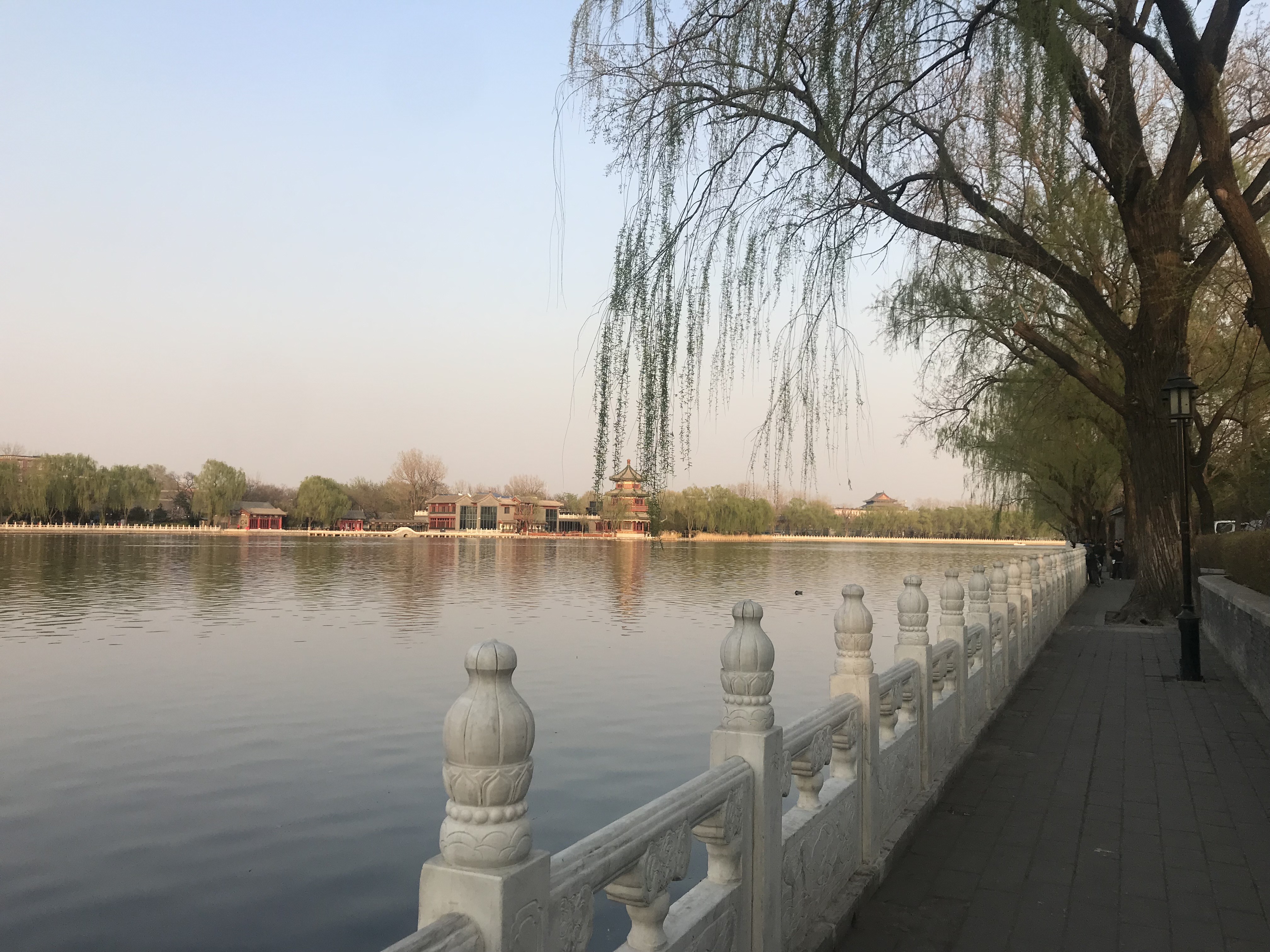 Non loin, un lac (qui est plutôt un très grand étang) est entouré de magnifiques saules pleureurs et nous avons la chance d'arriver comme les cerisiers commencent à fleurir. Le paysage est magnifique et il est très agréable de déambuler parmi les chinois qui profitent aussi de ce printemps tardif et qui jouent au mah-jong et à d'autres jeux de hasards sur les rives du lac et dans les parcs.