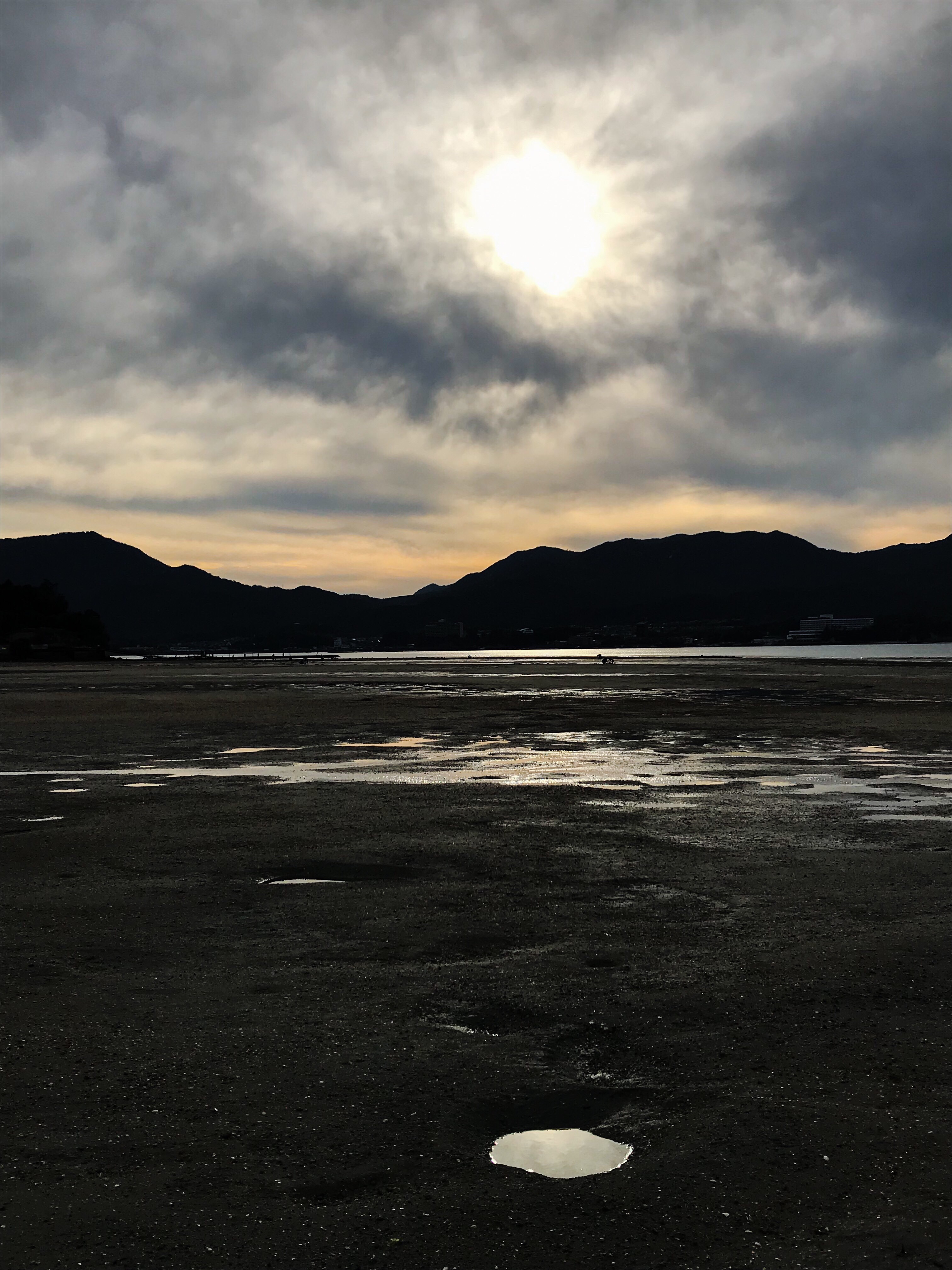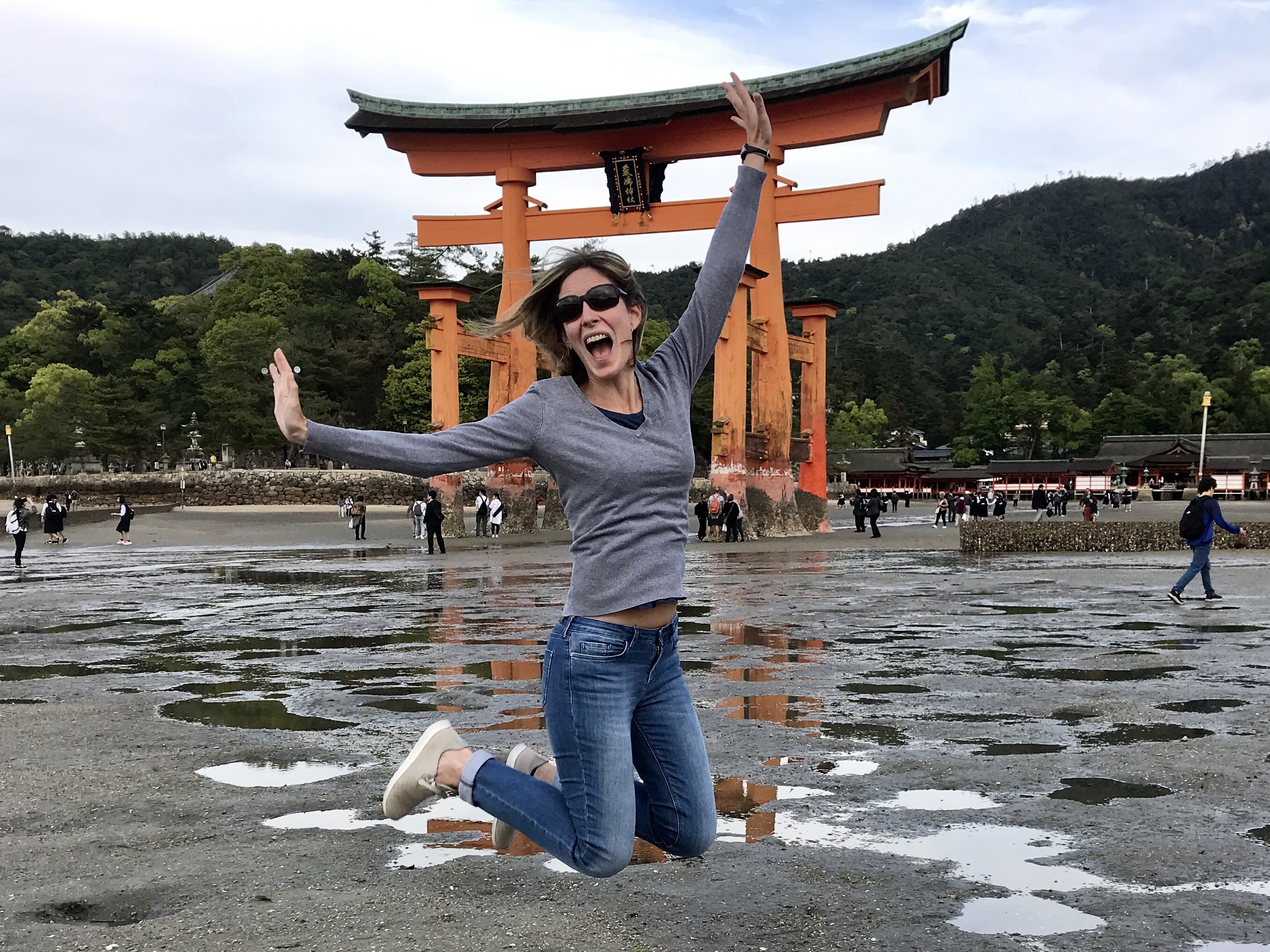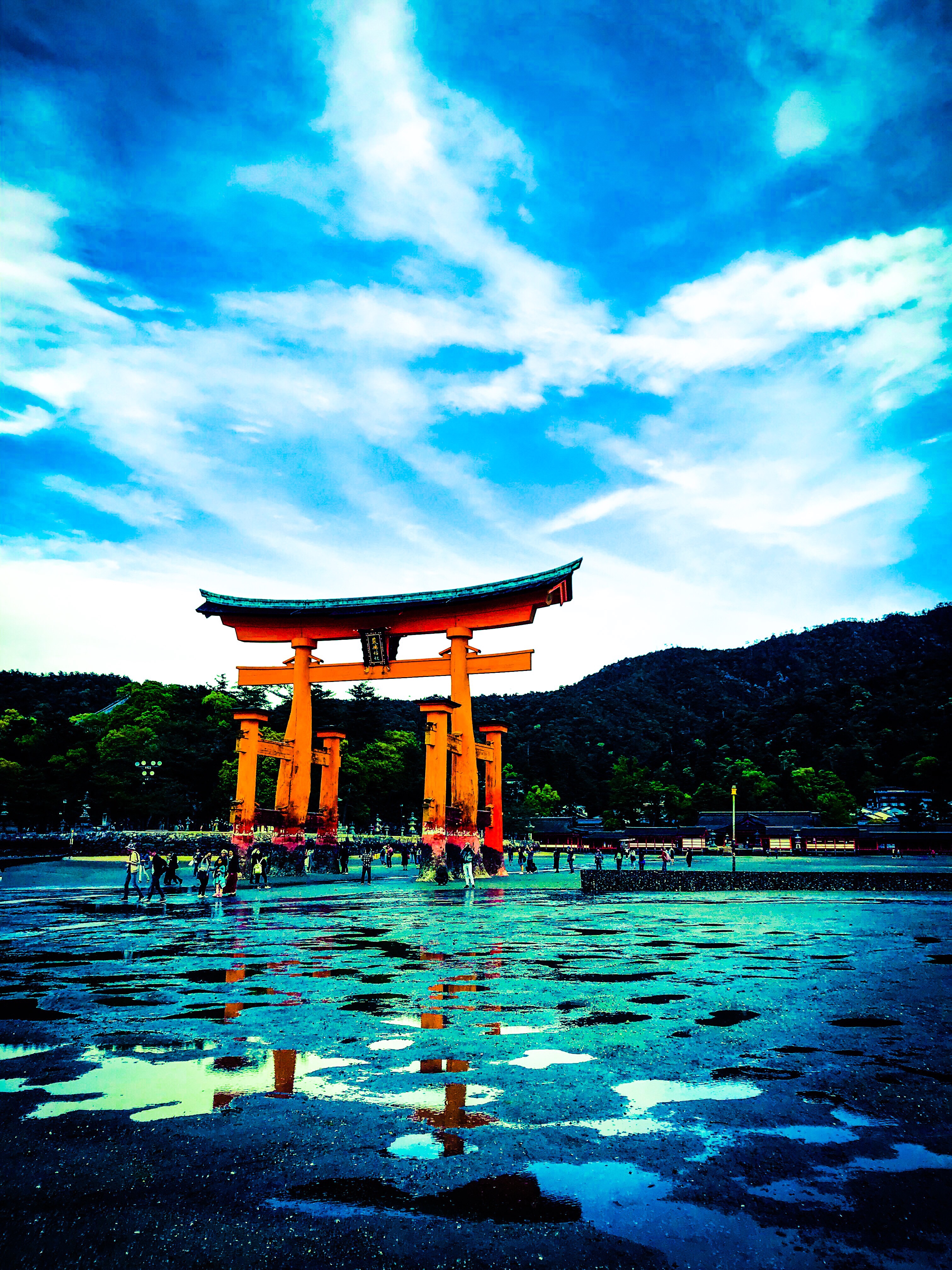 Le lendemain, avec Geneviève, nous nous sommes dirigés en bateau vers Miyajima, petit village de l'île d'Itsuku, considérée comme l'un des trois plus beaux sites du Japon. En arrivant à Miyajima, un temple sur pilotis est gardé par une immense arche ("torii") qui se trouve sur la grève à marée base, et dans l'eau à marée haute.