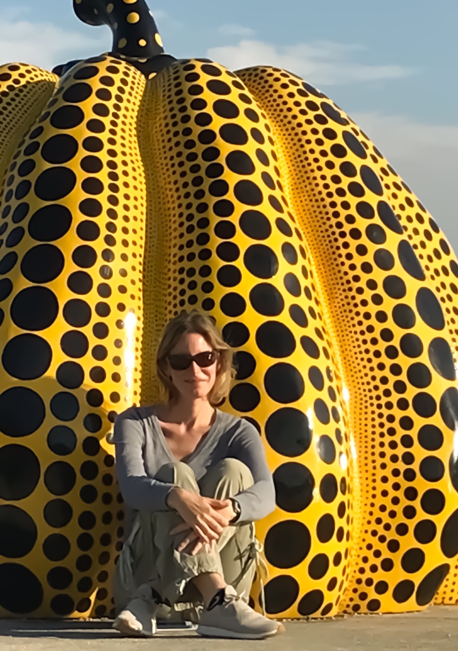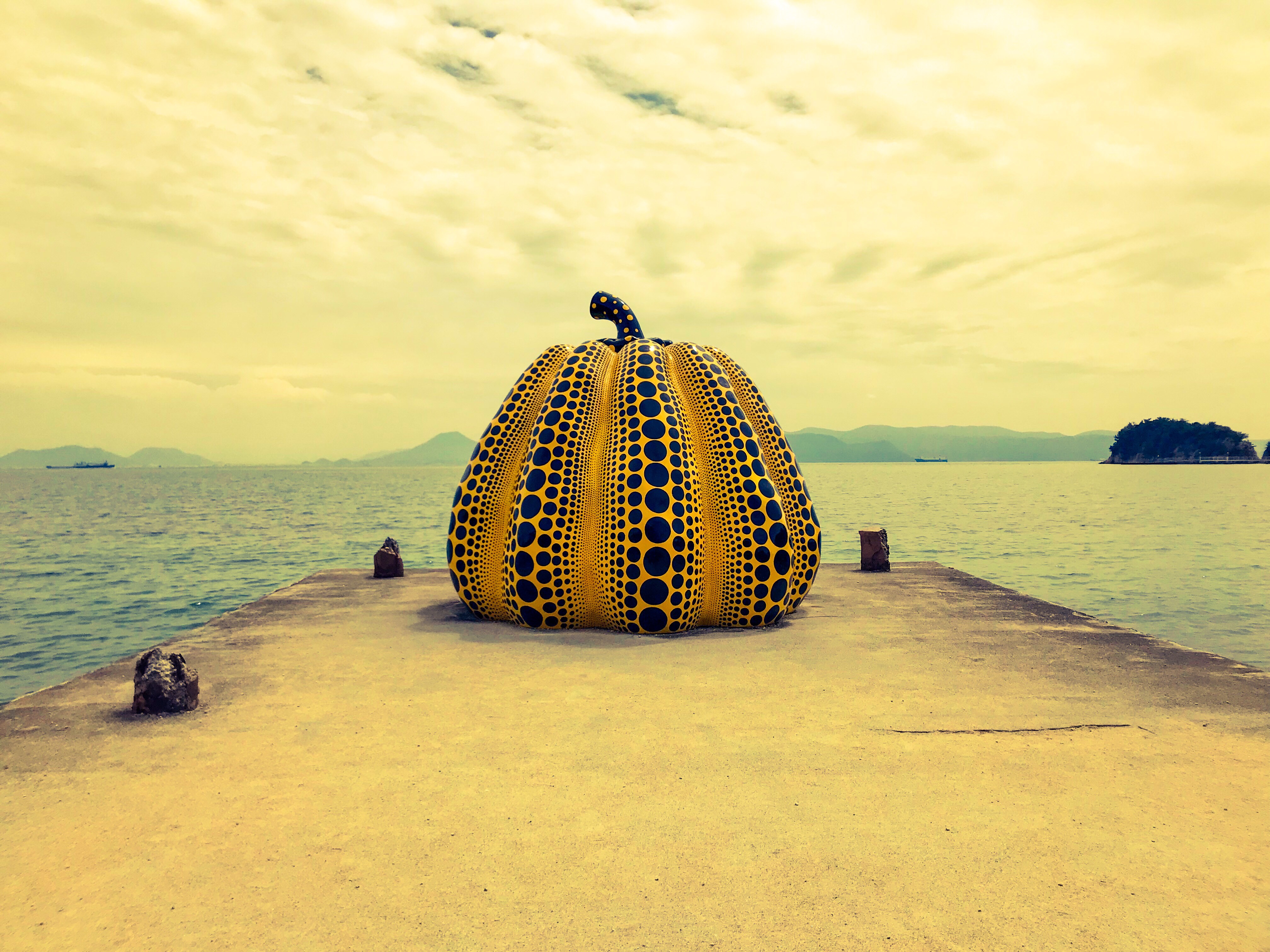 À notre arrivée à Naoshima, une citrouille rouge de Yayoi Kusama (celle qui expose à Shanghai) souhaite la bienvenue aux passagers des traversiers et aussitôt à terre toute la structure d'accueil est orientée vers le tourisme artistique. Il est très facile de s'orienter et un guide très bien fait contient toutes les infos sur les activités et les horaires de bus et de traversiers et des préposés sont localisés aux endroits stratégiques pour aider les visiteurs.