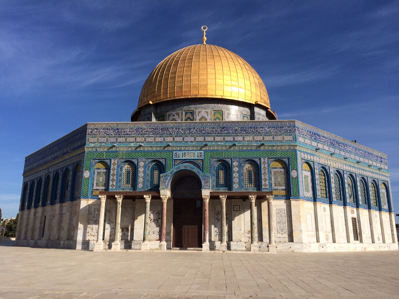Nous aurons le temps d’une visite rapide mais marquante. En arrivant sur l’esplanade, un vieil homme nous aborde et s’offre pour nous guider pour quelques shekels. La place est presque déserte mais quelques musulmans sont rassemblés ici et là. La place est magnifique dans la lumière matinale et l’atmosphère est solennelle. Le fameux dôme trône à l’extrémité nord de la place, et sous lui, réside le rocher de la création. Le monde aurait été créé par Dieu à partir de cette pierre et c’est de ce lieu que Mohamet aurait fait son ascension pour négocier avec Dieu le nombre de prières quotidiennes. L’esplanade est un lieu des plus saints pour les musulmans comme pour les juifs! Ce qui explique aussi la tension qui y règne… À un certain moment un groupe se met à clamer ce que nous ne pourrons établir comme des cris de revendications ou des chants religieux.