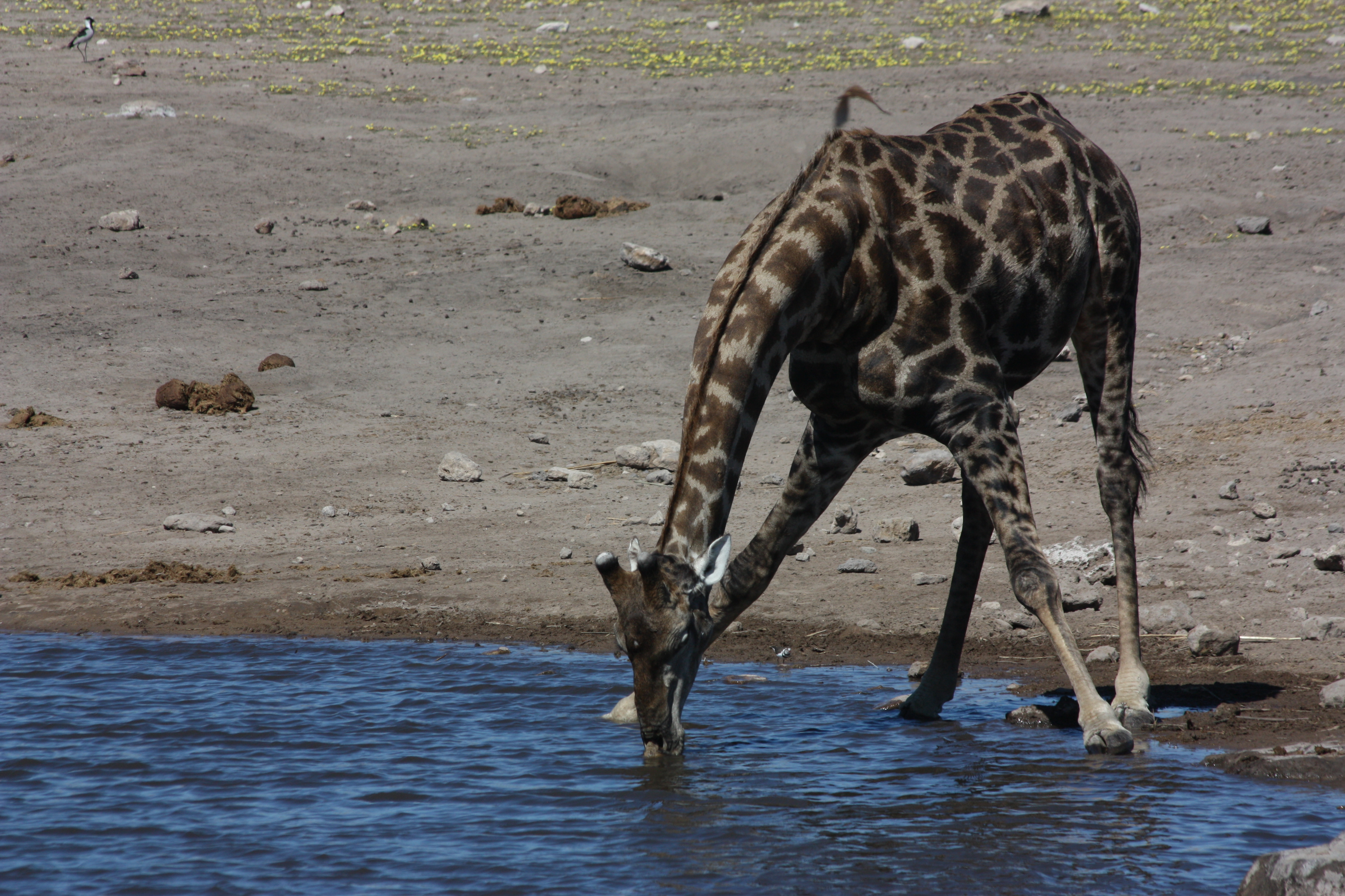Le lendemain, nous nous levons un peu avant le soleil et nous rendons au point d’eau où une girafe nous démontre comment on boit quand notre tête est montée sur quatre longues pattes et un cou démesuré…