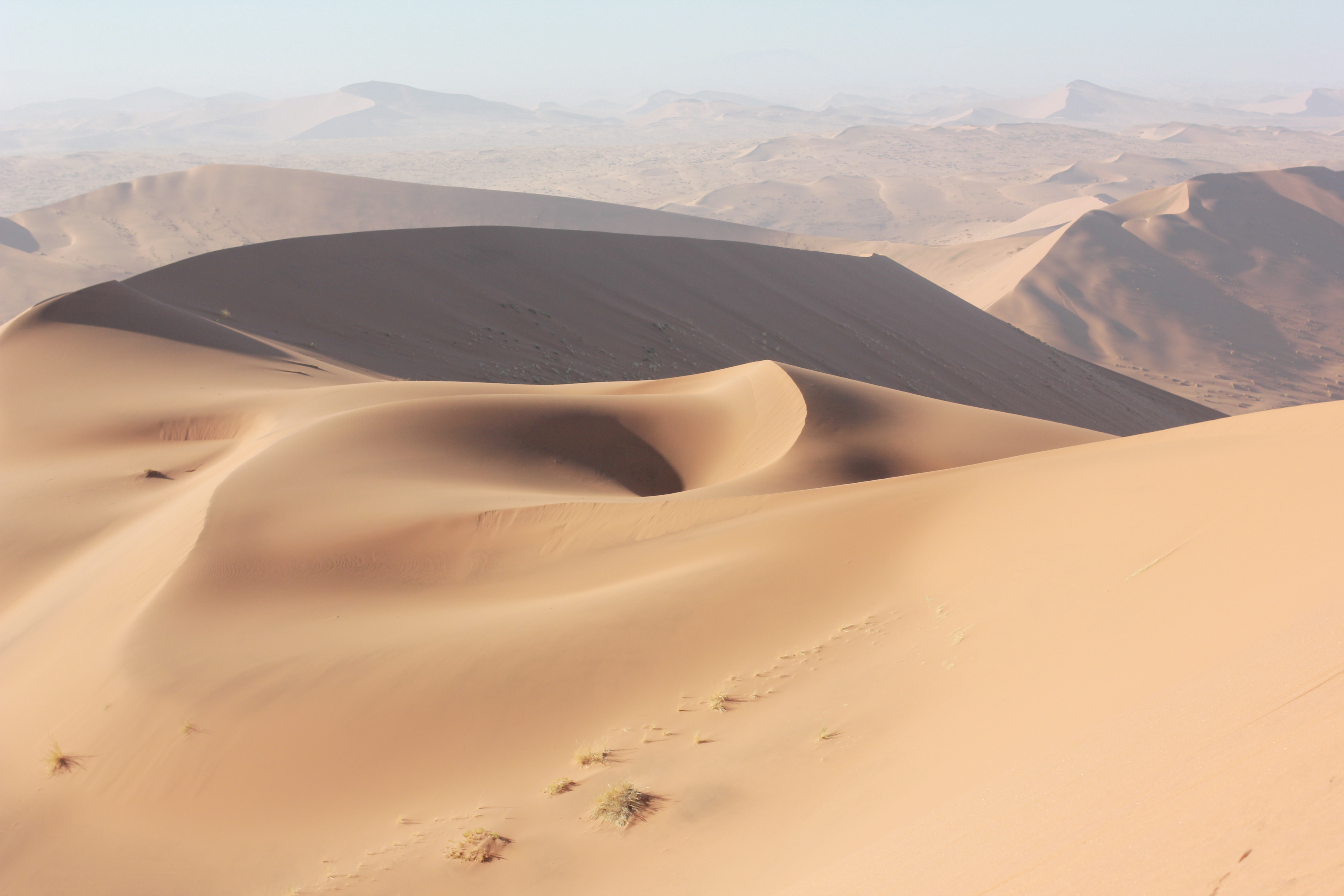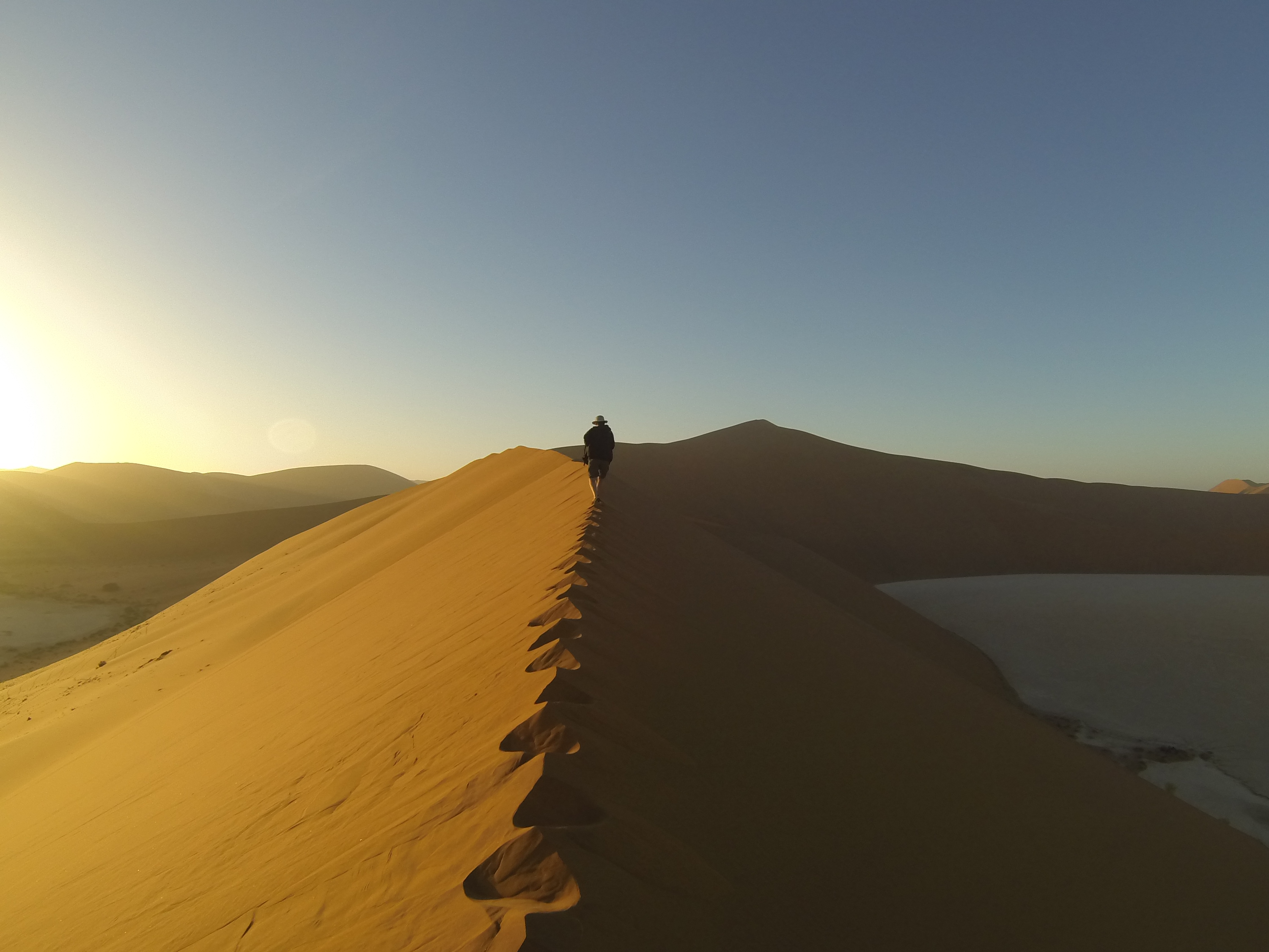 Pour en revenir à Sesriem, nous y avons donc établi notre campement pour 3 nuits et dès la première journée, nous nous sommes engagés sur la route de 60km qui traverse la vallée bordée de dunes. Au Km 45, la « dune 45 » s’avance presque jusqu’à la route et permet une ascension relativement aisée. En la grimpant en fin de journée, nous avons eu une vue splendide sur les dunes de l’autre côté de la vallée qui offraient leurs flancs au soleil couchant.