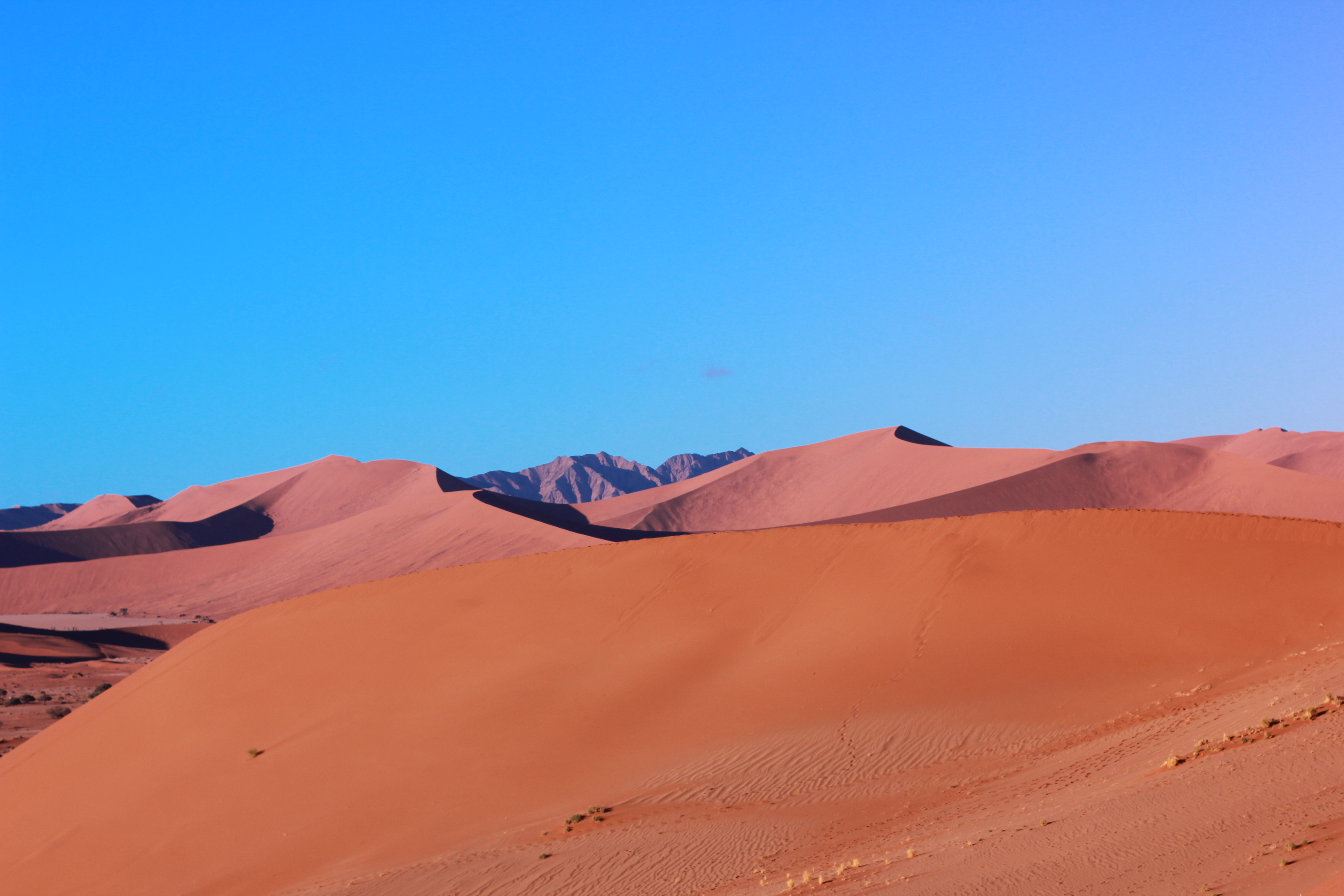 Notre véhicule sous un arbre en prévision de la chaleur accablante qui ne saurait tarder, nous nous engageons sur le sentier menant à la dune de Sossusvlei. A mi-chemin de l’ascension de la dune, le soleil se pointe le nez derrière les dunes à l’est et en quelques minutes sa lumière vient illuminer les formes orangées qui nous entourent. Indescriptible…